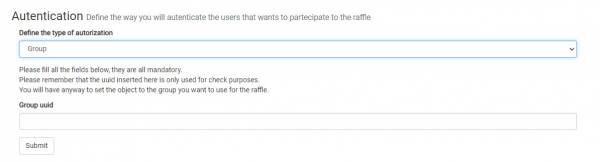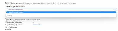 Authentication- Determines the way you want to authorize people to enter your Raffle (if using a group or without authorization)Delayed start- Define the delayed starting date and timeAutomatic end- Define the automatic ending date and time of the raffleWinner- Shows the winner(s) or allows you to decide a (new) winnerStatistics- Shows- the total number of subscribers,