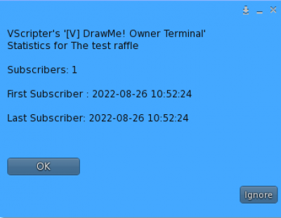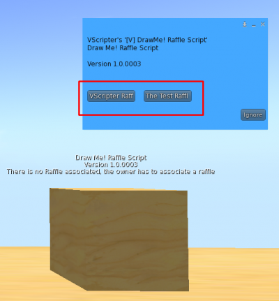 When an avatar that is not the Owner clicks on an associated DrawMe! Raffle Script object, they will enrol, and receive an appropriate message: