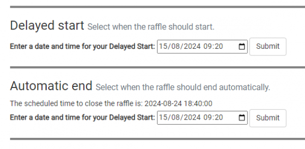 As for the delayed start, you will have to set the SL Time you want the raffle to close