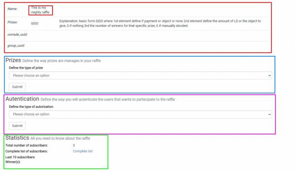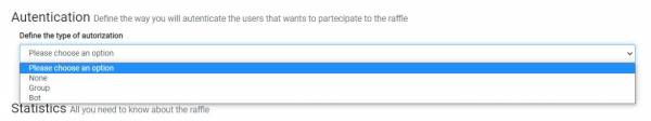 Authentication- Determines the way you want to authorize people to enter your Raffle (if using a group or without authorization)Statistics- Shows- the total number of subscribers,