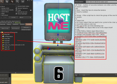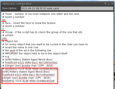 Once everything is ok, the notecard is fully complete and the items are inside the box, you can click on the chair to activate it
